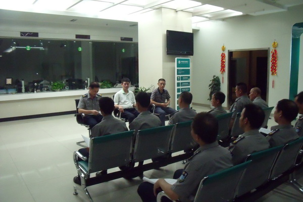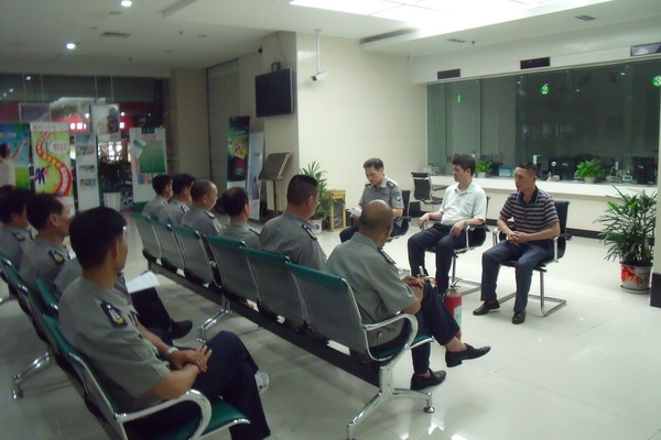 (上圖)為了組織好此次專項銀行突發(fā)事件應急演練的消防安全演練,黃瑞明科長和林銘春中隊長以實例向保安員講解應對犯罪嫌疑犯人在營業(yè)廳實施搶劫暴力侵害時,要以“平息事態(tài)、控制局面、防止擴大散、減少損失”為主要原則,針對不同情況采取制止、保護、求援、疏散等方法,確保銀行營業(yè)場所的安全,并對消防安全“四個能力”建設、火災基礎知識、高層建筑逃生自救、辦公樓常用消防設施的檢查、使用等多個方面進行對保安員詳細講解培訓。