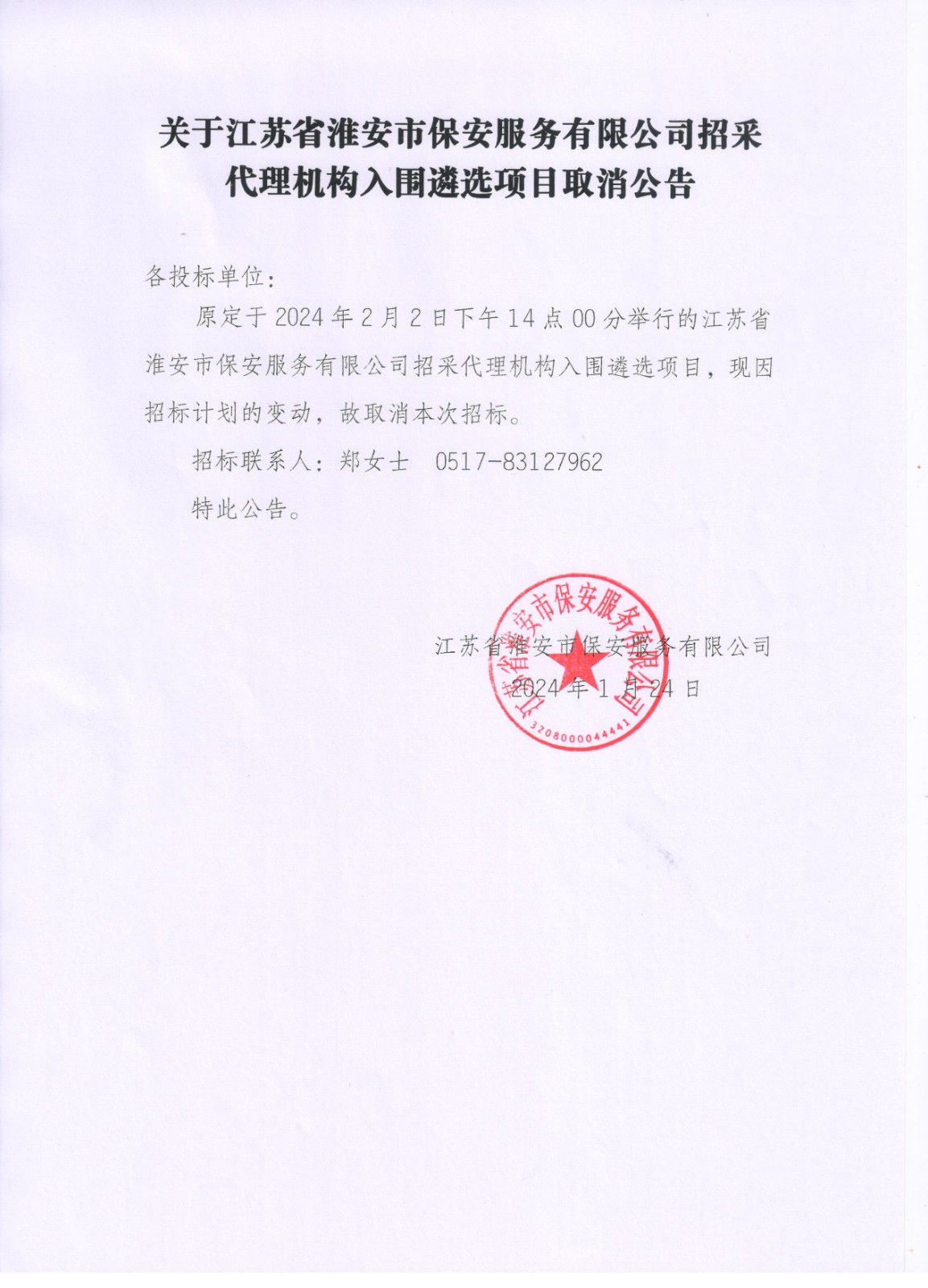 江蘇省淮安市保安服務(wù)有限公司招采代理機(jī)構(gòu)入圍遴選項(xiàng)目取消公告